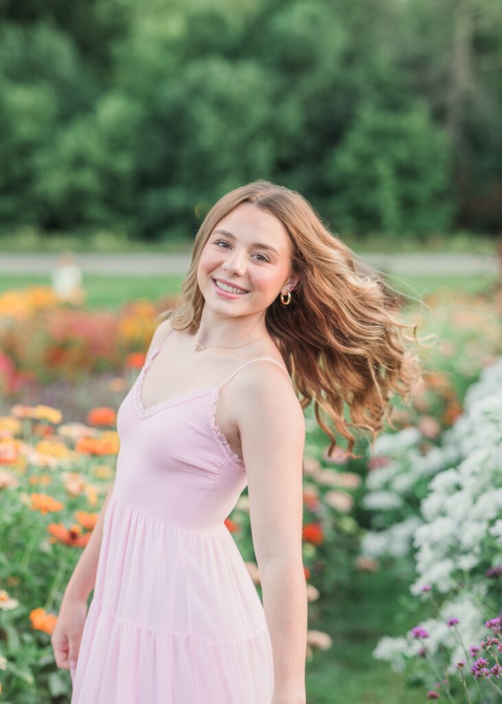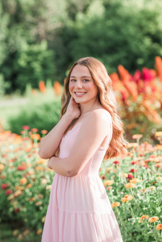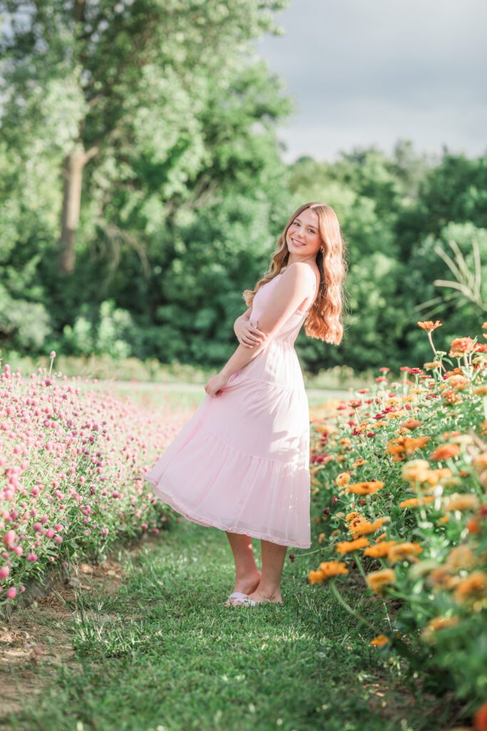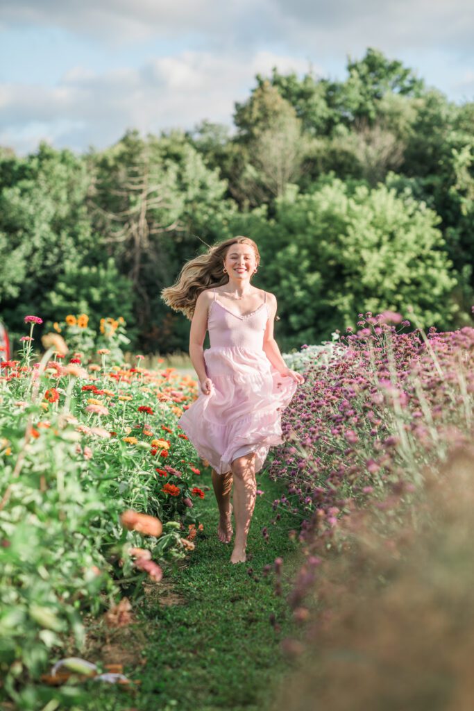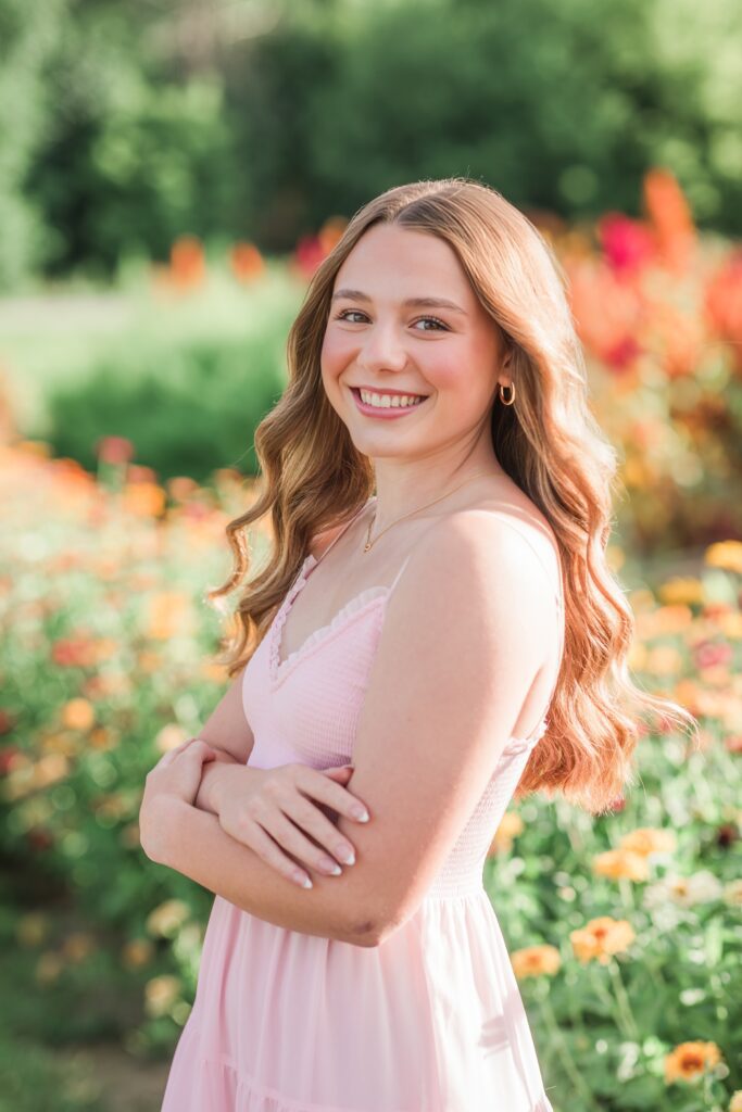 We had an ideal scenario for the start of Sadie’s senior session: overcast skies and cooler temps (!!!) Sadie wanted to capture the gorgeous flower farm at Ankley Family Farm. As our session continued, the grey skies started to become a little darker and the very low chance of rain that was in the forecast started to quickly move in. A half hour into the session we rescheduled her session for a week later and it was the best decision. Sadie’s bright, beautiful outfits popped against the beautiful flowers that were full in bloom! Sadie is so sweet, bubbly and kind – we had the best evening together capturing her gorgeous shoot!